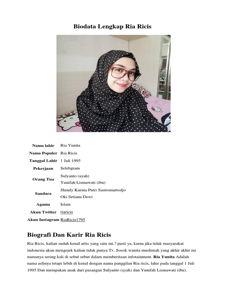 Beliau itu masih bolak balik jakarta batam untuk mengurus pekerjaannya, kata oki setiana dewi. Sementara itu, ria ricis masih liburan. Sebab, sang ayah sulyanto baru saja meninggal dunia. Ria ricis lahir dari pasangan sulyanto dan yunifah lismawati. Dua keinginan ayah ria ricis adalah melihat sang putri menyandang gelar sarjana dan menikah.
